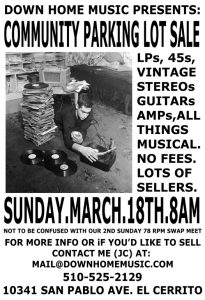 We are planning another Down Home Community Parking Lot Sale for Sunday, March 18th starting at 8 AM (WEATHER PENDING). The usual assortment of LPs, 45s, etc. stereo equipment, instruments & amps, and all things music. No seller fees. No entry fees. (Not to be confused with our 2nd Sunday 78 rpm swap meet.) PLEASE SHARE!
