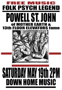 Saturday May 19th, at 2pm Powell St. John of Mother Earth and 13th Floor Elevators fame will play selections from his vast array of originals. Visit him at http://www.powellstjohn.com/