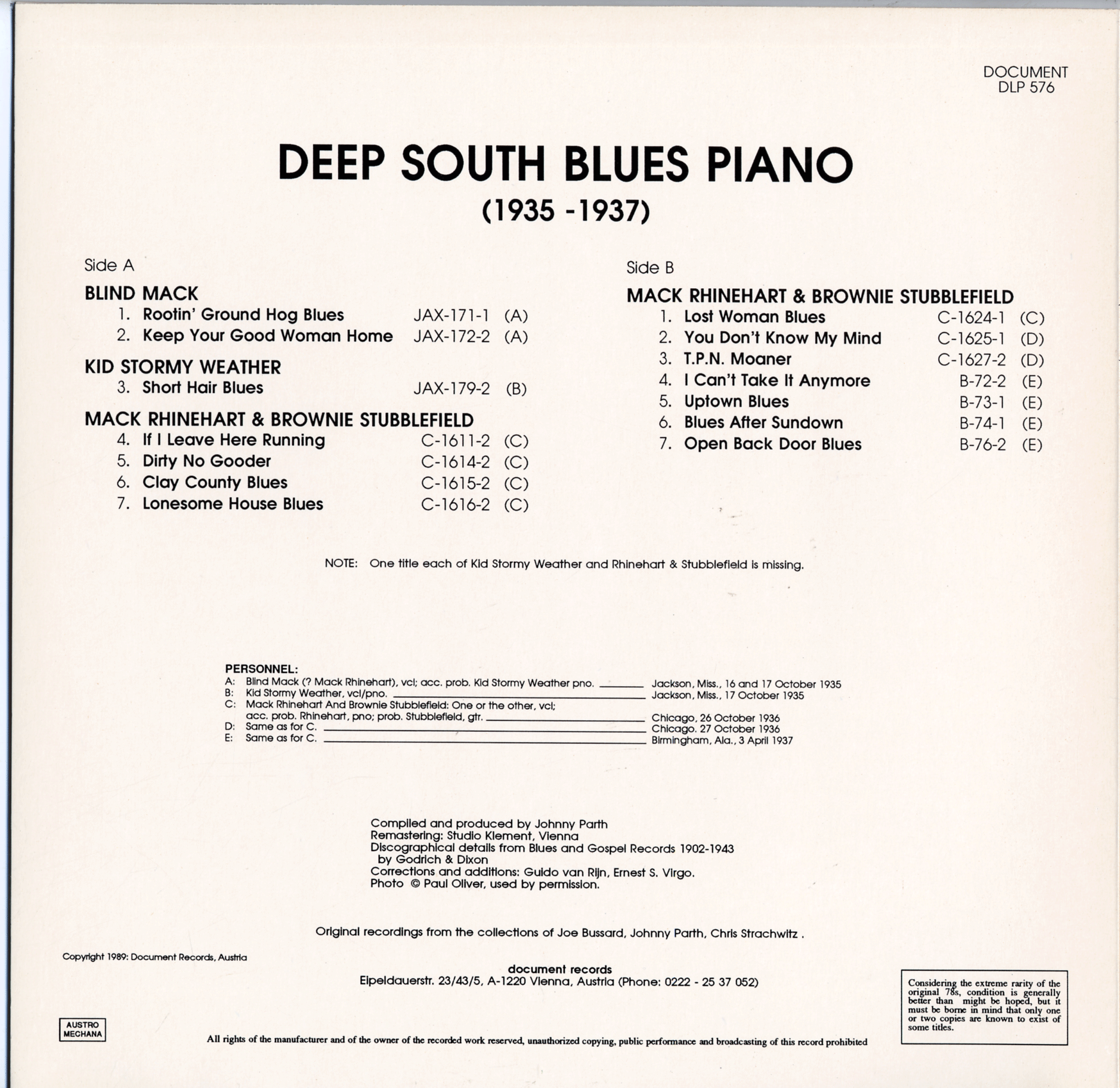 Deep South Blues Piano (1935-1937) DLP 576 Blind Mack Rhinehart Kid Stormy Weather Brownie Stubblefield
