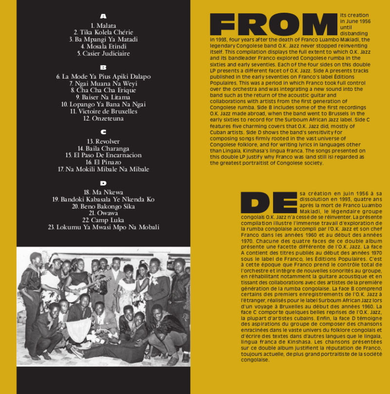 Side A presents tracks issued in the early seventies on Franco’s label Editions Populaires. This was a period in which Franco took full control over the orchestra and was integrating a new sound into the band such as the return of the acoustic guitar and collaborations with artists from the first generation of Congolese rumba such as Manuel d’Oliveira and Camille Feruzi. Side B includes some of the first recordings O.K. Jazz made abroad, when the band went to Brussels in the early sixties to record for the Surboum African Jazz label. Side C features five charming covers that O.K. Jazz did, mostly of Cuban artists. Side D shows the band’s sensitivity for composing songs firmly rooted in the vast universe of Congolese folklore, and for writing lyrics in languages other than Lingala, Kinshasa’s lingua franca.